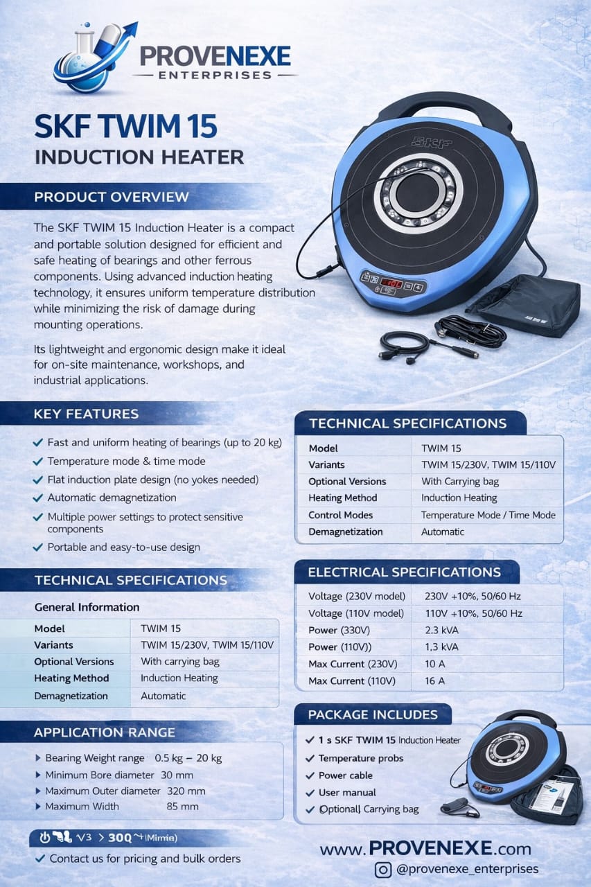 The SKF TWIM 15 Induction Heater is a compact and portable solution designed for safe and efficient heating of bearings and ferrous components. It ensures uniform heating and reduces the risk of damage during installation.