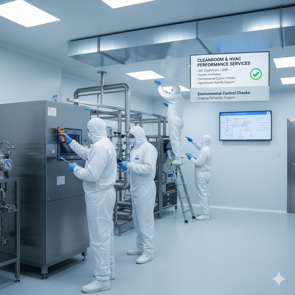 Specialized cleanroom and HVAC performance services including system verification, environmental control checks, and operational stability support in accordance with ISO cleanroom and GMP guidelines.